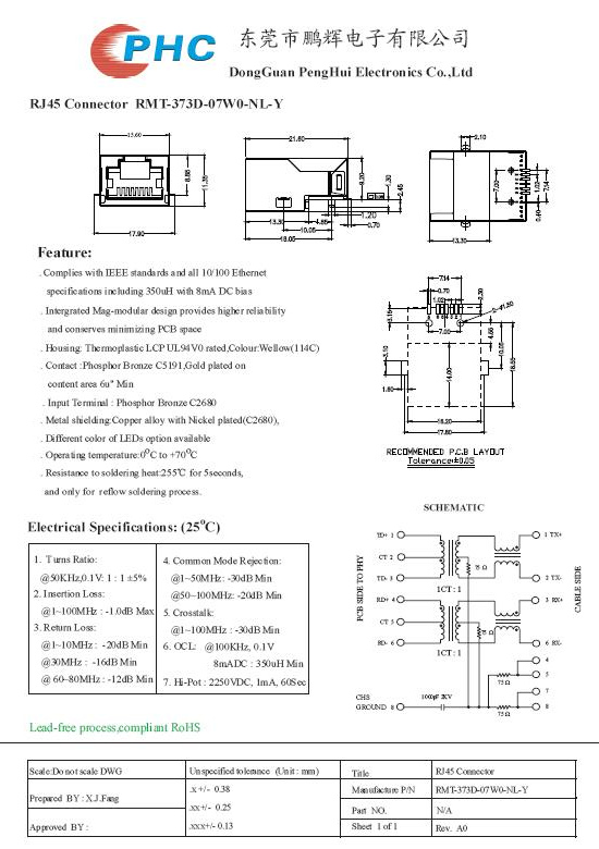订购:RMT-373D-07W0-NL-Y 21.6mm RJ45 沉板SMT 百兆网口 板高8.85